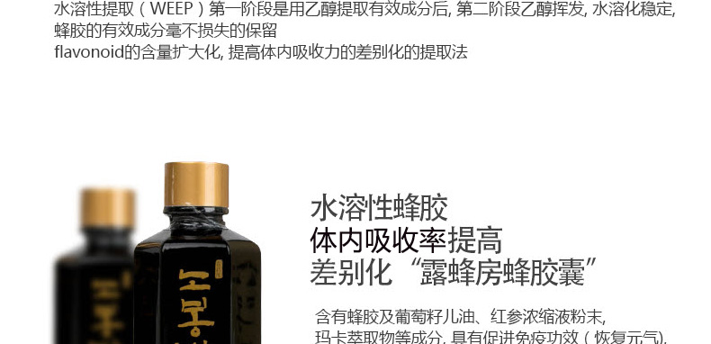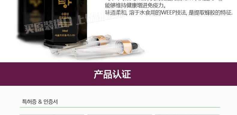 韓國Seoul Propolis露蜂房水溶性蜂膠濃縮液 抗菌抗氧化 50ml*2瓶/盒—— 1、富含5倍濃縮蜂膠提取物,紅參濃縮液粉末,瑪卡萃取物等成分! 2、增強免疫力,抗菌抗氧化。 3、男女老少皆適用。 |