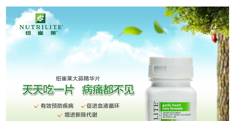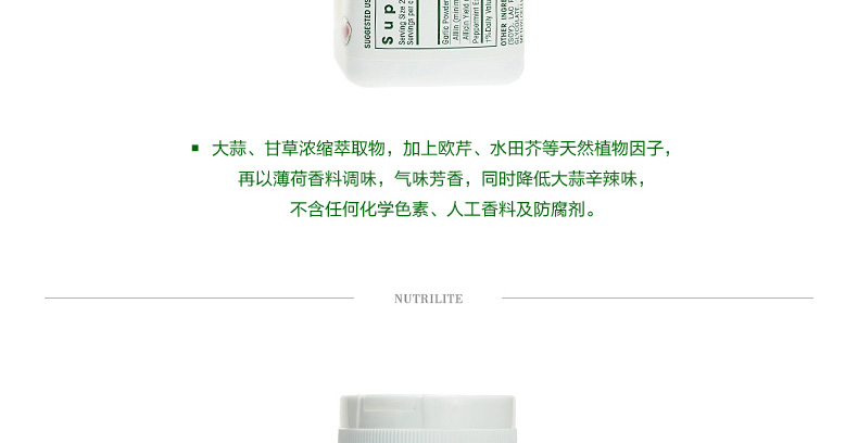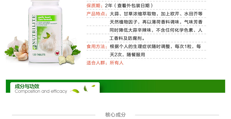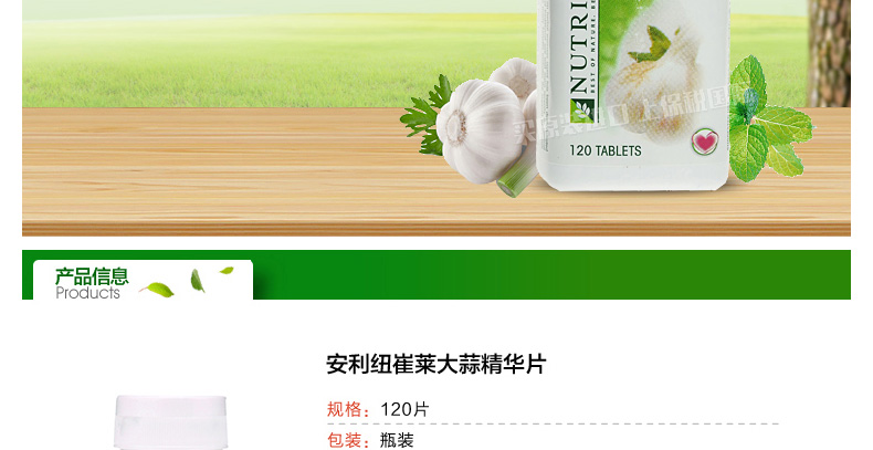 美國安利紐崔萊NUTRILITE大蒜精油濃縮素片大蒜片 殺菌抗病毒 120片/瓶—— 1、富含大蒜,甘草濃縮萃取物,薄荷,歐芹等天然植物成分! 2、具有殺菌抗病毒,抗過敏助消化,增強免疫力功效。 3、天然薄荷清香,清爽口氣。 |
