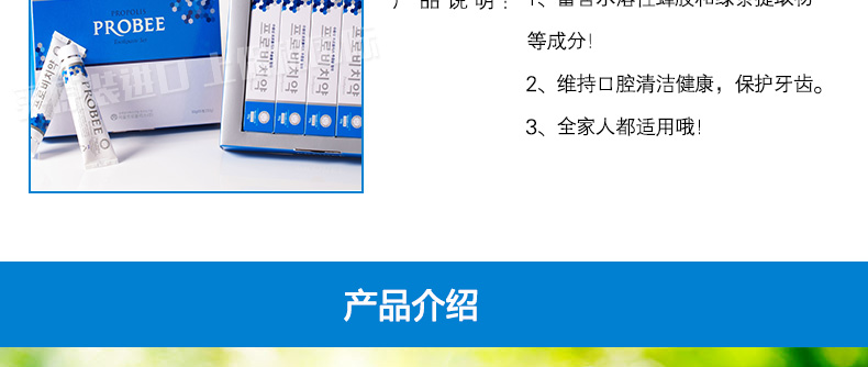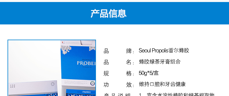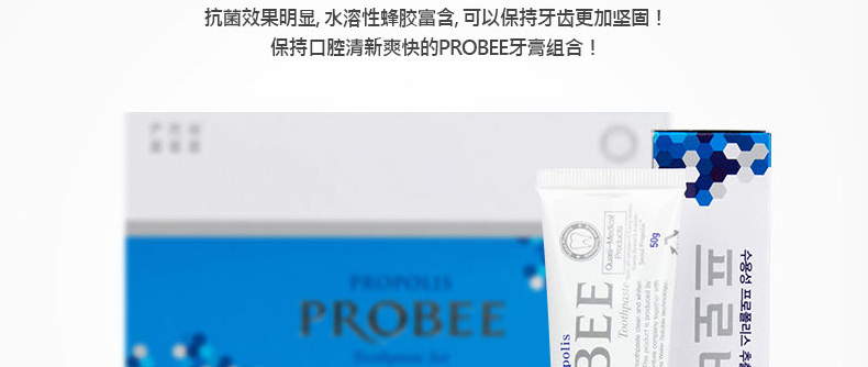 韓國Seoul Propolis PROBEE蜂膠綠茶牙膏組合 維持口腔牙齒健康 50g*5/盒—— 1、富含水溶性蜂膠和綠茶提取物等成分! 2、維持口腔清潔健康,保護牙齒。 3、全家人都適用哦! |
