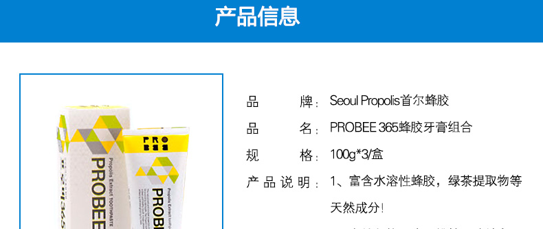 韓國Seoul Propolis PROBEE 365蜂膠牙膏組合 保護(hù)牙齒 100g*3/盒 |