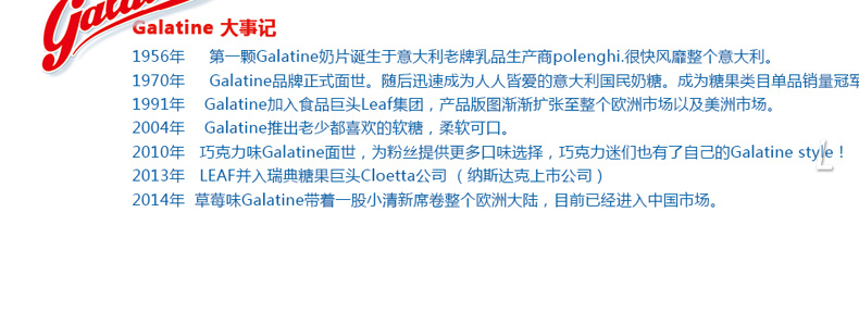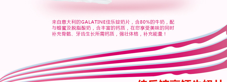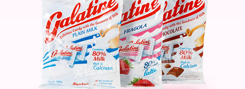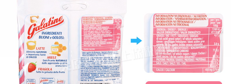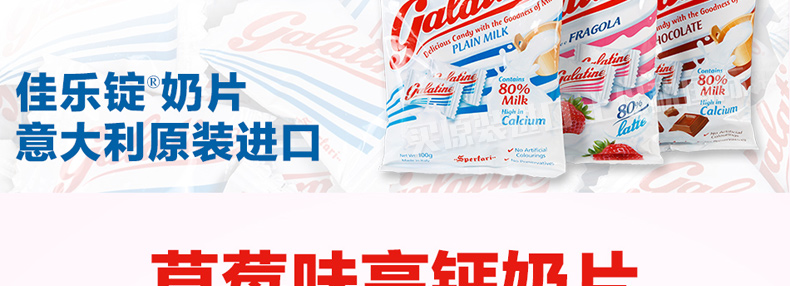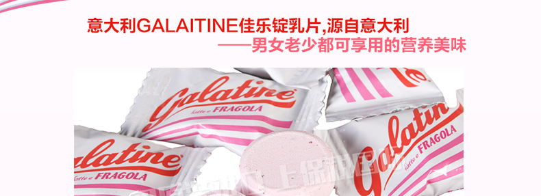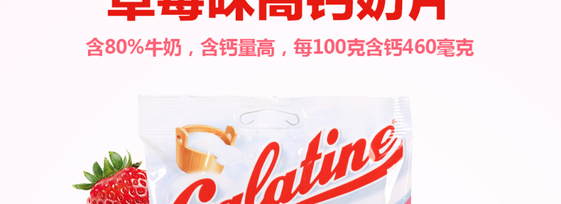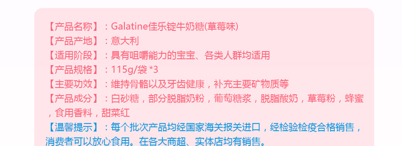3袋裝 意大利佳樂定Galatine草莓味牛奶糖 奶片高鈣營養不上火的糖果休閑零食 115g/袋*3—— 1、成分:白砂糖、部分脫脂奶粉、葡萄糖漿、脫脂酸奶、草莓粉。 2、含80%牛乳,并配與蜂蜜及優酪乳,含有豐富的鈣質。 |