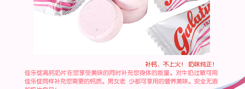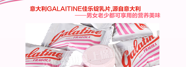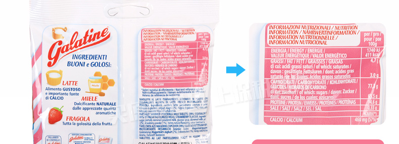 3袋裝 意大利佳樂定Galatine三種口味奶片牛奶糖 原味牛奶 草莓味 巧克力味 各一袋 115g/袋 高鈣營養(yǎng)不上火糖果零食—— 1、成分:白砂糖、部分脫脂奶粉、葡萄糖漿、脫脂酸奶、蜂蜜等。 2、含80%牛乳,并配與蜂蜜及優(yōu)酪乳,含有豐富的鈣質(zhì)。 |