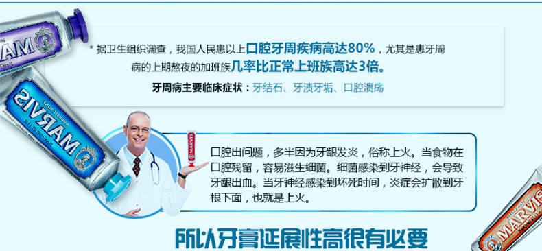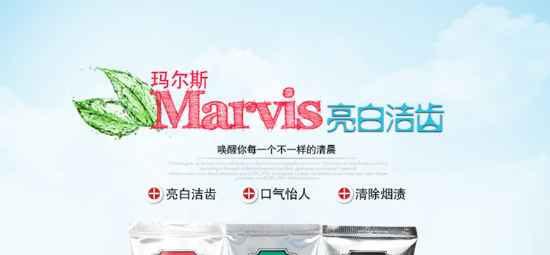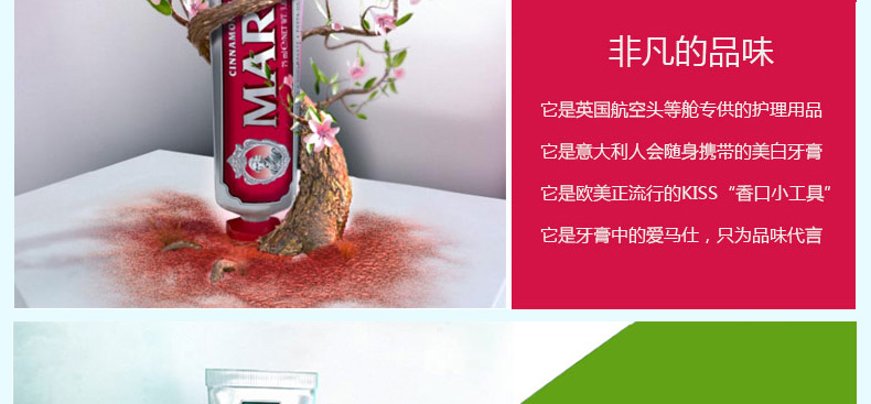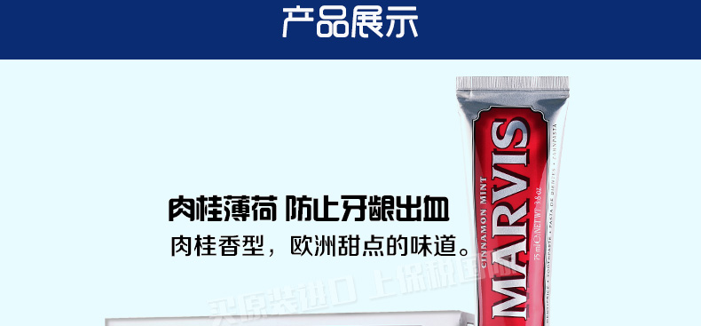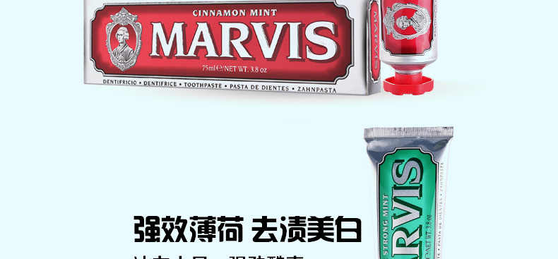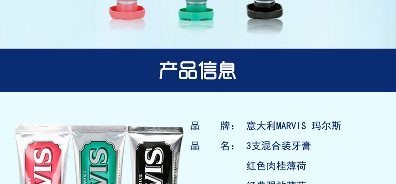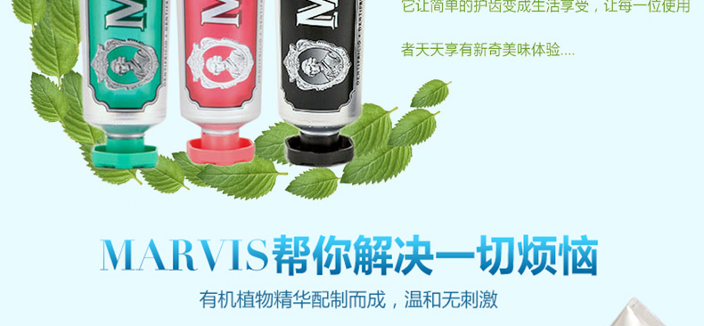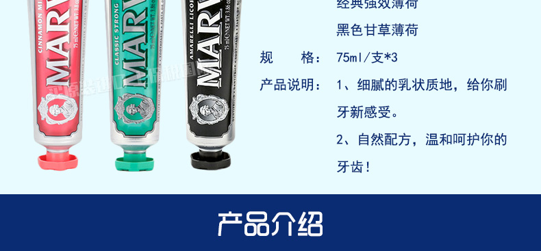 意大利瑪爾斯MARVIS牙膏3支組合裝 紅色肉桂薄荷+經典強效薄荷+黑色甘草薄荷75ml/支—— 1、肉桂薄荷+強效薄荷+甘草薄荷,3支組合裝。 2、細膩的乳狀質地,給你刷牙新感受。 3、自然配方,溫和呵護你的牙齒! |