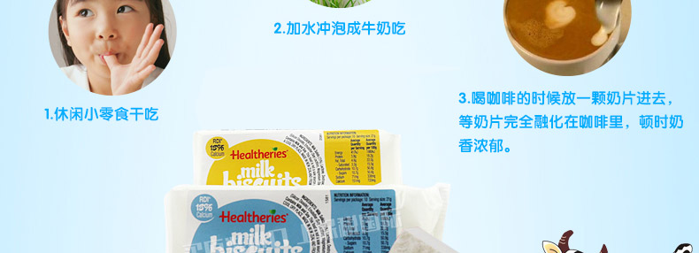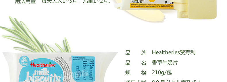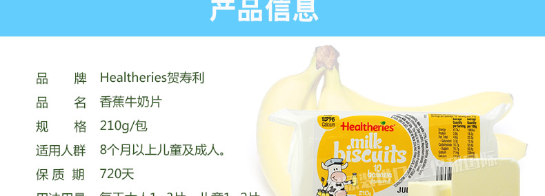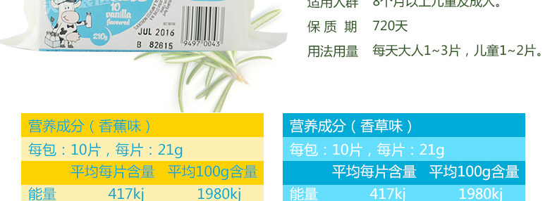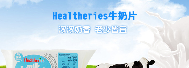 2包裝 賀壽利Healtheries牛奶片 香蕉/香草 兩種口味任選 香濃營養補充鈣質零食餅干 210g/包*2—— 1、每塊奶片成分:全脂奶粉、葡萄糖、乳糖;不包含:小麥、面筋、人造甜味劑、人工色素。 2、過敏人群請注意:含有牛奶和大豆,不含小麥成分。 |