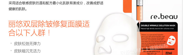 2盒裝 韓國麗悠 REBEAU 雙層除皺修復面膜 膠原蛋白面膜貼 22ml*5片/盒*2—— 1、膠原蛋白形成皮膜,柔和裹住皮膚,改善松弛肌膚,淡化細紋。 2、面膜緊貼度強,持水力優秀,讓精華直達皮膚內部。 |