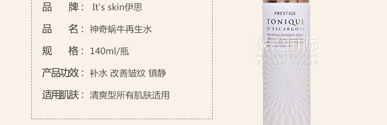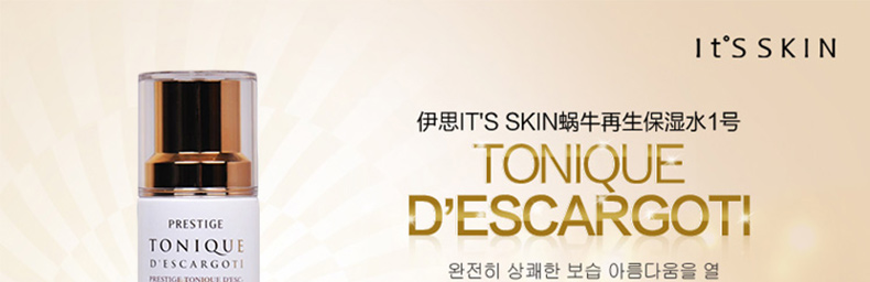 韓國 It's skin伊思晶鉆蝸牛化妝水Ⅰ 神奇再生水 補水 改善皺紋 鎮靜 (清爽型所有肌膚適用) 140ml/瓶—— 1 具有神奇效果的美膚水,含螺旋蝸牛分泌液29400mg(濃度21%),能夠全面改善皮膚素質。 2 對于淡化痘印疤痕、暗瘡印、斑點和縮小毛孔方面有非常神奇的功效。 3 肌膚能夠明顯變得柔嫩緊實、細紋減少,并且能夠保濕補水,提亮膚色