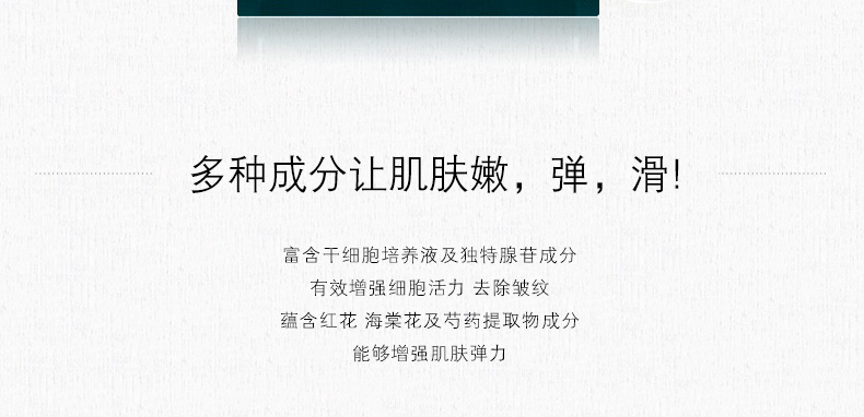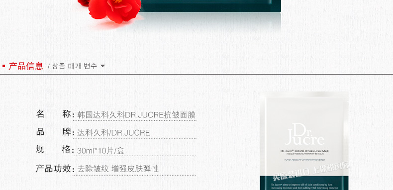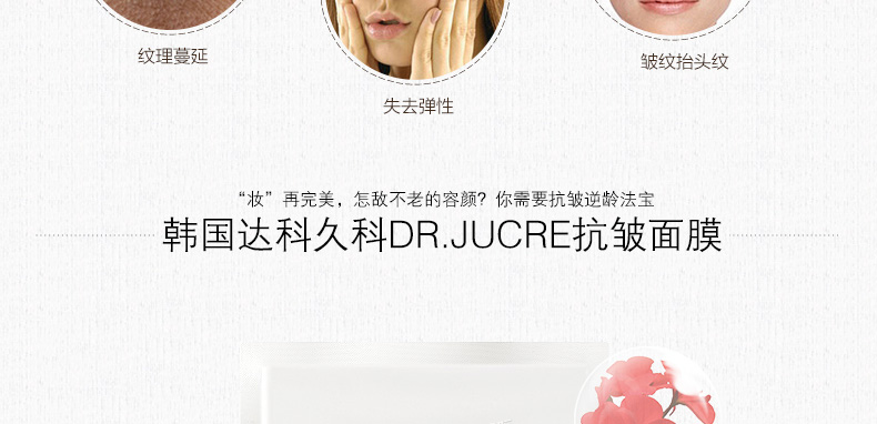 韓國達科久科DR.JUCRE抗皺面膜 去皺紋增彈力 30ml*10片/盒—— 1、腺苷成分有效幫助去除皺紋。 2、紅花,海棠花及芍藥提取物成分,增強皮膚彈性。 3、蘊含干細胞培養液等護膚成分。 |