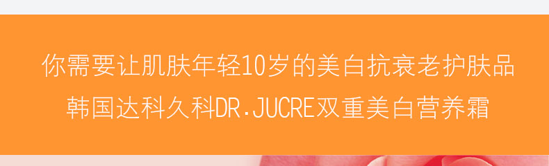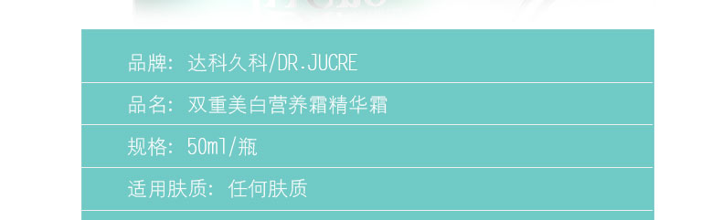 韓國達科久科DR.JUCRE雙重美白營養霜精華霜面霜 修復激活緊致彈力 50ml/瓶—— 1、含有尼克酰胺,腺苷,精氨酸等護膚成分。 2、深層滋潤,修復激活,緊致彈力,改善膚質。 3、配合達科久科美白再生系列使用,效果更好。 |