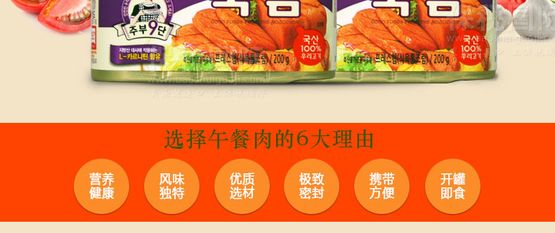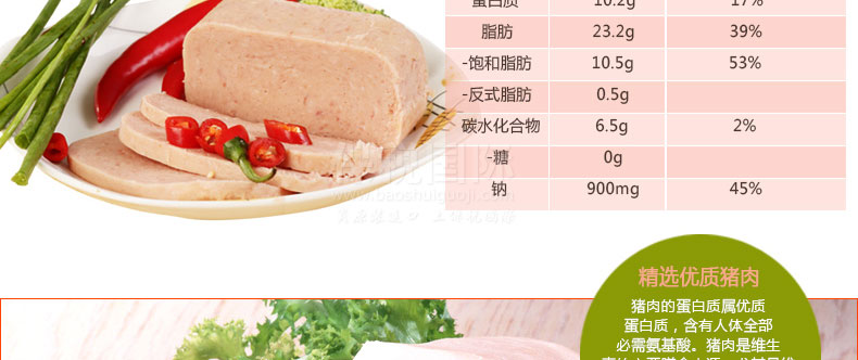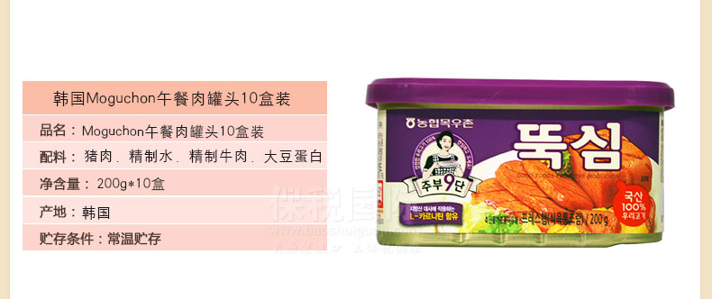 韓國Moguchon午餐肉罐頭10盒裝—— 1、使用100%韓國產豬肉 2、含有作用于脂肪酸的L-肉堿 3、每盒含量約1人份 此次產品為試用促銷裝,僅限3個,售完為止。 |