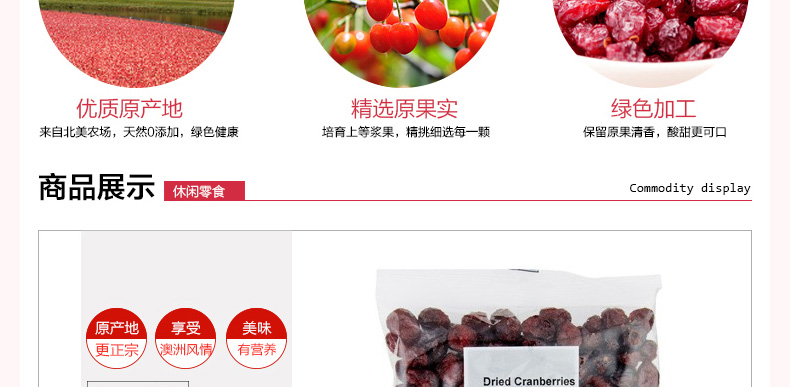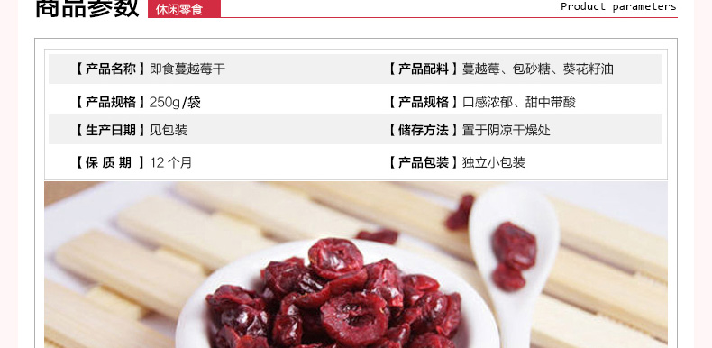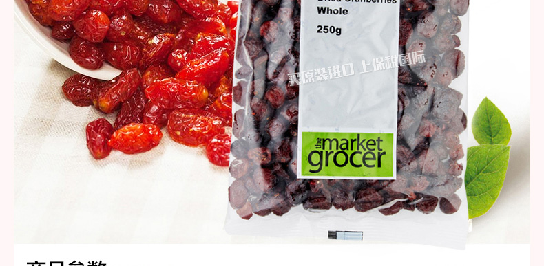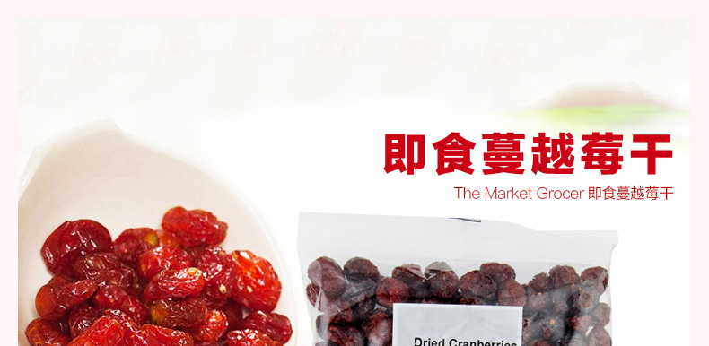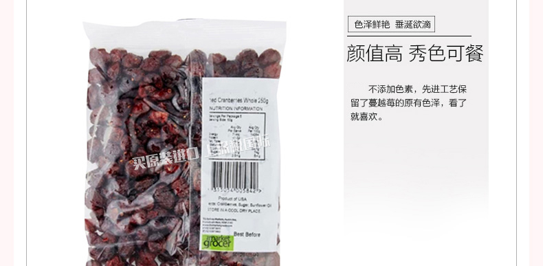 澳大利亞the market grocer 即食蔓越莓干 整顆果粒干果零食 休閑食品250g/袋—— 1、有抗衰老、降低胃潰瘍及胃癌的發(fā)病率,避免老年癡呆,預(yù)防泌尿感染。 2、蔓越莓含有對抗肌膚老化的自由基,為肌膚添加營養(yǎng),越吃越年輕。 |