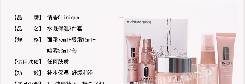 倩碧Clinique水凝保濕3件套 超水感美肌 保濕霜75ml+眼部凝膠15ml+噴霧30ml—— 1、面霜75ml+眼霜15ml+噴霧30ml。 2、快速補(bǔ)水,持久水潤。 3、即刻滲透,清爽無油。 |