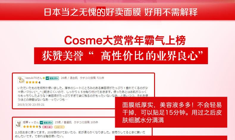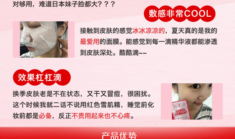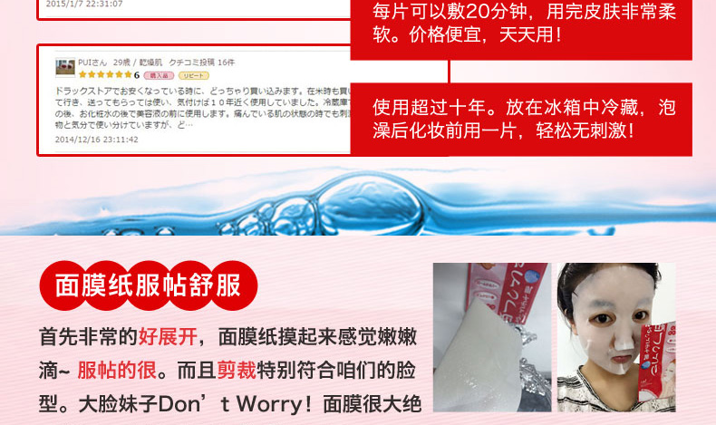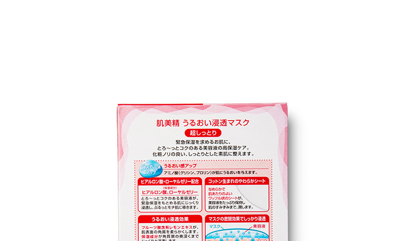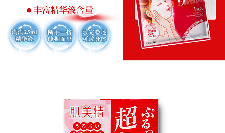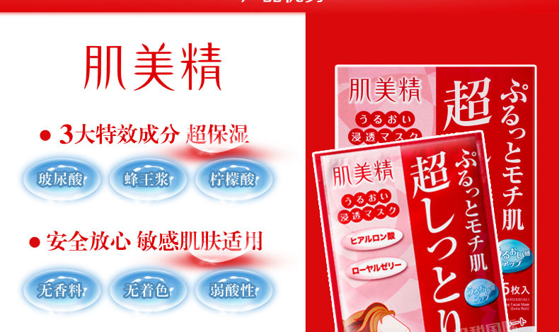 2盒裝肌美精kracie超浸透保濕面膜 緊急補水滲透補水 5片/盒*2—— 1、蘊含玻尿酸,蜂王漿及檸檬酸等三大成分。 2、特殊網格微導棉制成,精華快速滲透。 3、剪裁更立體,面膜更服帖。 |