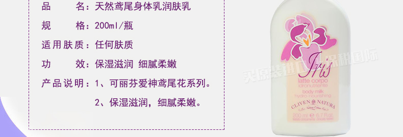 可麗芬CLIVEN愛神系列天然鳶尾身體乳潤膚乳 滋潤柔嫩 200ml/瓶—— 1、可麗芬愛神鳶尾花系列。 2、保濕滋潤,細(xì)膩柔嫩。 |