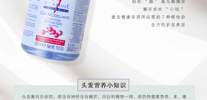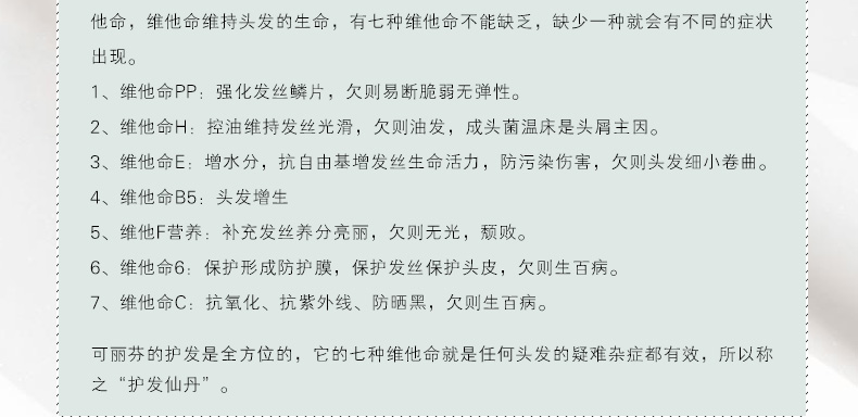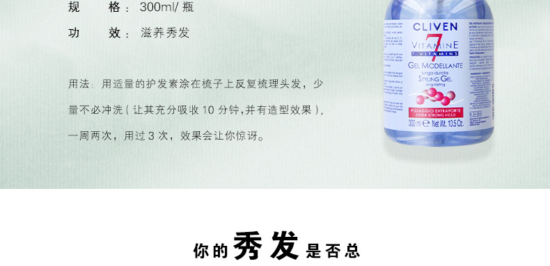 1、用適量的護發素涂在梳子上反復梳理頭發,少量不必沖洗(讓其充分吸收10分鐘,并有造型效果)一周兩次,用過3次,效果會讓你驚訝。 2、富含健康發質所必需的7種維他命,全方位護發養發。 |