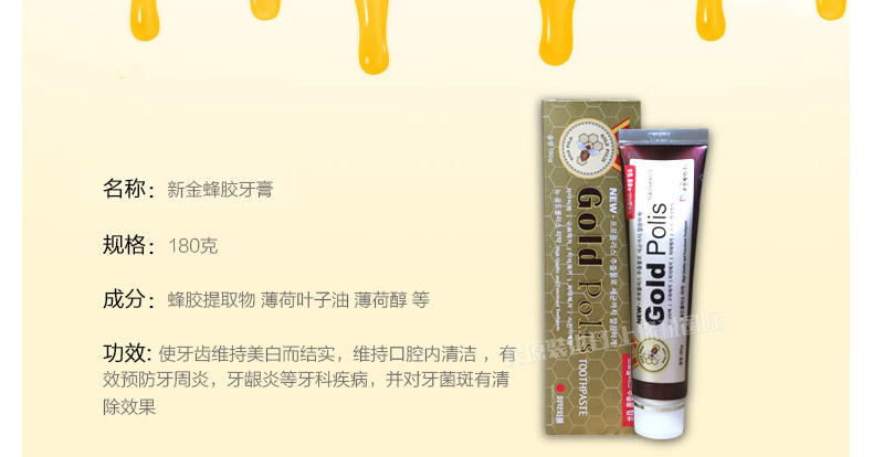 韓國朝鮮制藥 GOID POLIS新金蜂膠牙膏 預(yù)防口腔疾病 保持口氣清新 180g/支—— 1、含蜂膠提取物,薄荷葉子油,薄荷醇等成分。 2、不含色素,口感舒適。 3、預(yù)防口腔問題,保護牙齒,清新口氣。 |