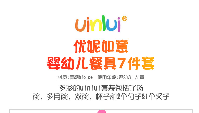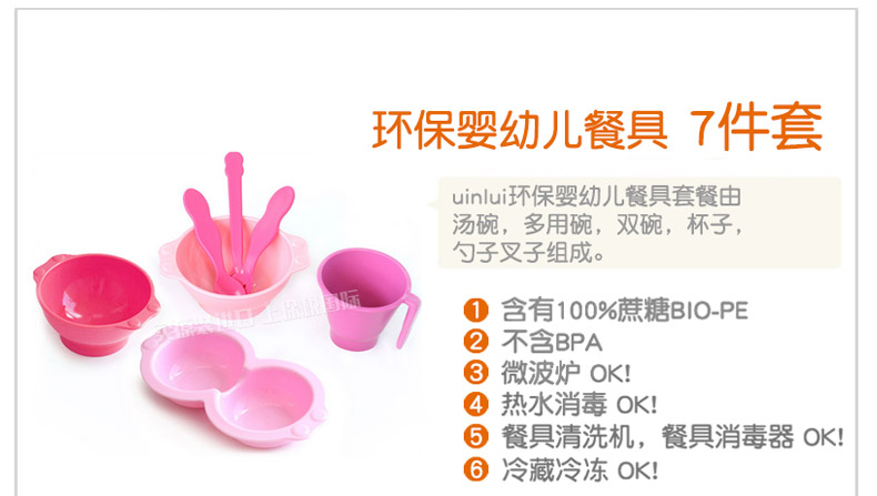 韓國優妮如意Uinlui多彩環保餐具 嬰兒健康碗勺 非塑料百分百甘蔗制品 粉色系7件套—— 1、由湯碗、多用碗、雙碗、杯子、2個勺子、1個叉子組成。 2、美國食藥局認證,無毒環保,支持消毒柜及微波爐加熱。 |