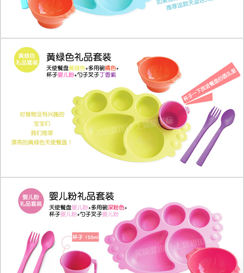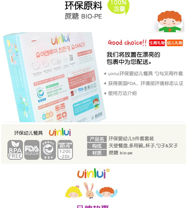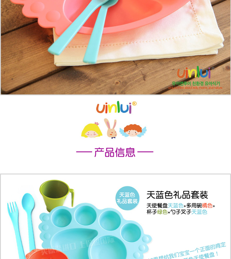 韓國優(yōu)妮如意Uinlui天藍(lán)色天使餐盤餐具5件套 多彩環(huán)保嬰兒健康碗勺水杯 |