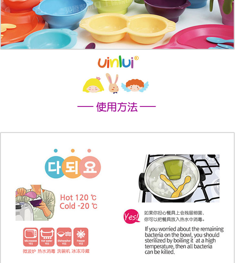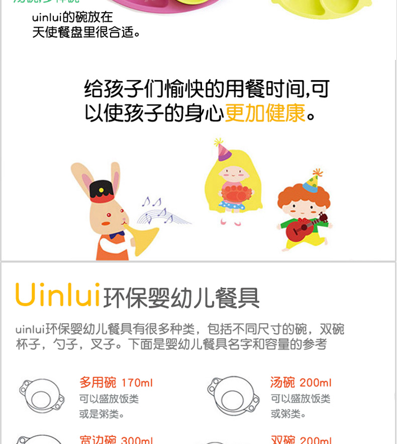 韓國優(yōu)妮如意Uinlui天藍(lán)色天使餐盤餐具5件套 多彩環(huán)保嬰兒健康碗勺水杯—— 1、橘色多用碗、天藍(lán)色天使餐盤、綠色杯子、天藍(lán)色刀叉各一個。 2、美國食藥局認(rèn)證,無毒環(huán)保,支持消毒柜及微波爐加熱。 |
