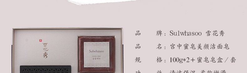 雪花秀Sulwhasoo宮中蜜皂美顏潔面皂含皂盒 清潔保濕嫩滑 100g*2+蜜皂皂盒—— 1、100g*2+蜜皂皂盒。 2、韓方美容成分的手工美顏皂。 3、請盡量保持干燥保存。 |