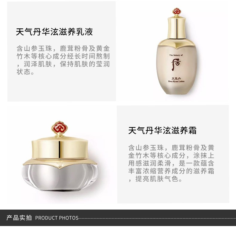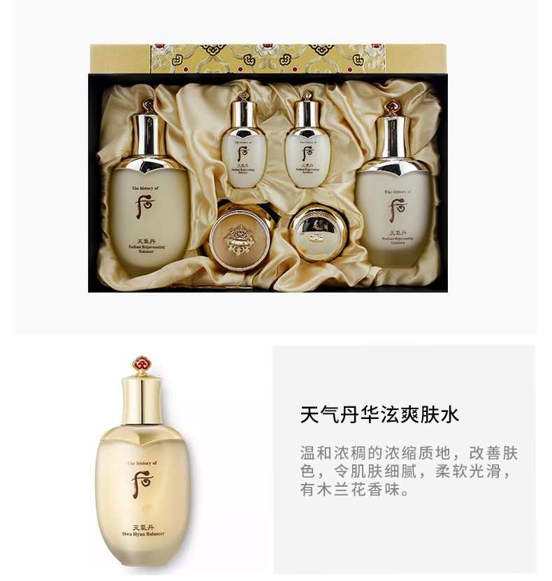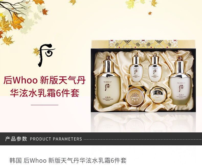 韓國 WHOO后 天氣丹華泫水乳霜禮盒(免稅版)修復滋養調理皮膚 3件套—— 1.華泫水 150ml:能調節天氣對肌膚影響的爽膚水,并且帶有精華成分 2.華泫乳液 110ml:能使肌膚變得光澤潤澤,從內之外煥發神奇的光彩 3.華泫面霜 25ml:含有生命力的珍貴成分,讓你的皮膚重獲新生。 |