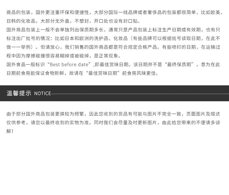 | 權利聲明: 保稅國際的所有商品信息、客戶評價、商品咨詢等內容,是保稅國際重要的經營資源,未經許可,禁止非法轉載使用。 注:本站所有商品均為原裝進口商品,境外直郵,全程海關監管,假一罰十,對任何冒用保稅國際行銷的行為,本站將追究法律責任,請放心購買。 |