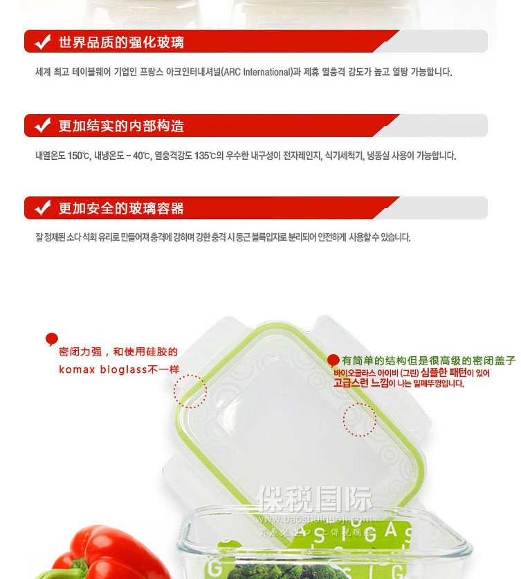 韓國KOMAX可買思BIOGLASS系列圓形密封玻璃保鮮盒2件套 670ml*2—— 1.四面鎖扣,密封性好:鎖扣緊閉設計,采用100%密封構造,持續保持食品新鮮度,同時盒子的鎖定裝置,通過了50萬次的彎曲試驗無任何異常。 2.加厚玻璃工藝,100%純天然食品級PP材料:加厚玻璃,質感體現,采用世界頂尖標準篩選的原材料,高純度玻璃實現透明度突破升級;盒蓋100%食品級PP材質+100%純天然硅膠,做到了真正的安全、環保、健康,全家放心。 注:產品尺寸可能存在誤差,以實物為準。 |