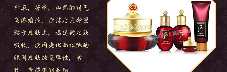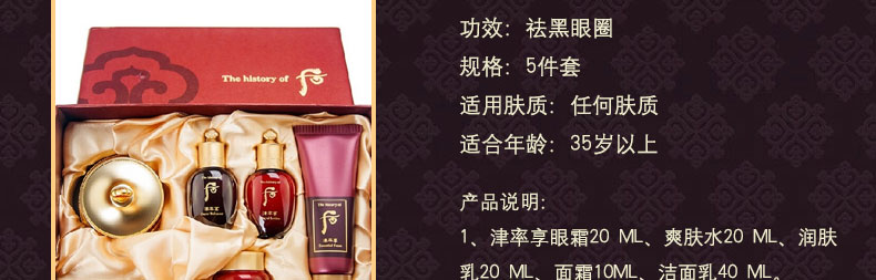 韓國WHOO后津率享眼霜套盒 紅花凝霜護膚套裝 祛黑眼圈祛眼袋—— 1、津率享眼霜20 ML、爽膚水20 ML、潤膚乳20 ML、面霜10ML、潔面乳40 ML。 2、使松弛的眼周皮膚恢復彈性,緊致,變得滋潤亮麗的眼霜。 |