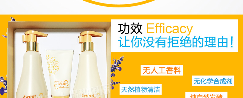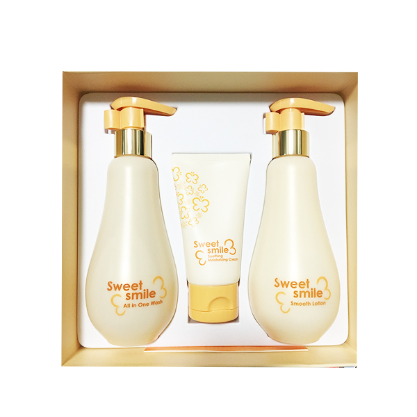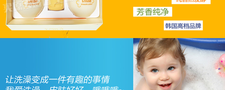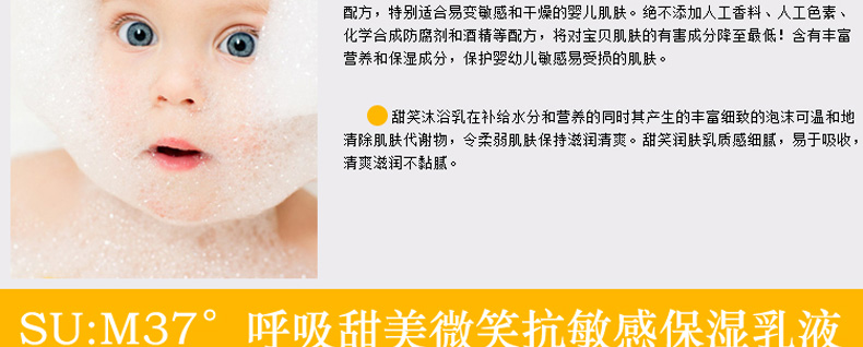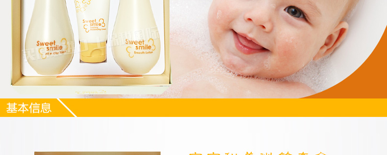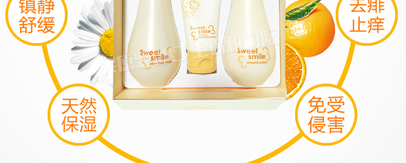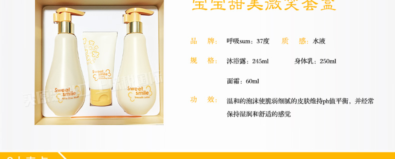 韓國呼吸sum:37度 寶寶甜美微笑套盒洗發沐浴面霜兒童套裝—— 1.溫和的泡沫使脆弱細膩的皮膚維持ph值平衡,并經常保持濕潤和舒適的感覺 2.沐浴露:245ml 身體乳:250ml 面霜:60ml |