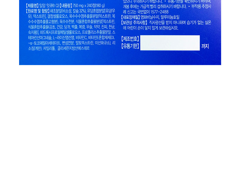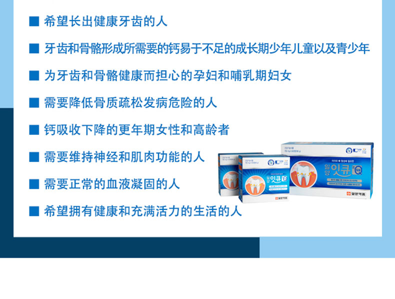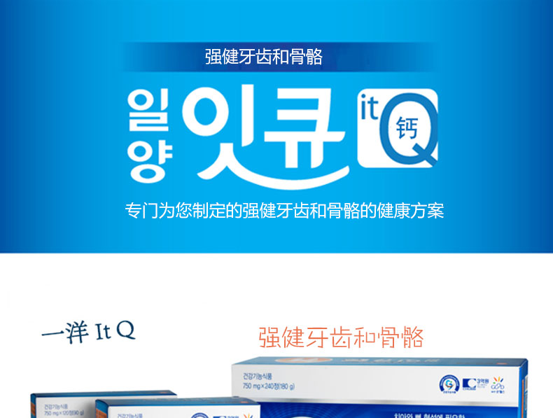 | 產品說明 | 韓國[一洋藥品] 健齒&骨骼 It Q 鈣片 240片 750mg x 240片(180g)/盒—— ①專為您制定的強健牙齒和骨骼的健康方案~ ②針對需要維持牙齒健康的老年和中年人,希望通過維持牙齒健康從而實現健康飲食生活的人設計 | |||