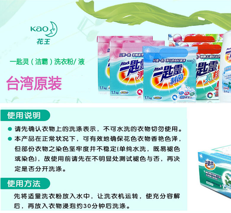臺灣 花王一匙靈亮彩洗衣粉 加香濃縮型無磷超能機洗凈白去漬洗衣粉1.9KG/盒