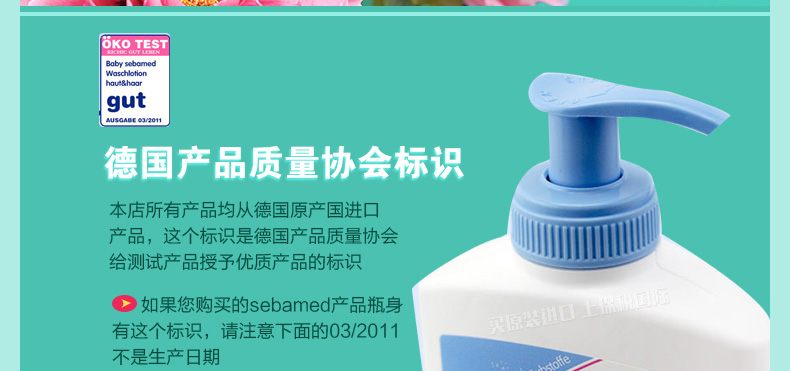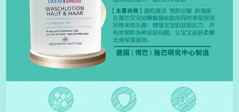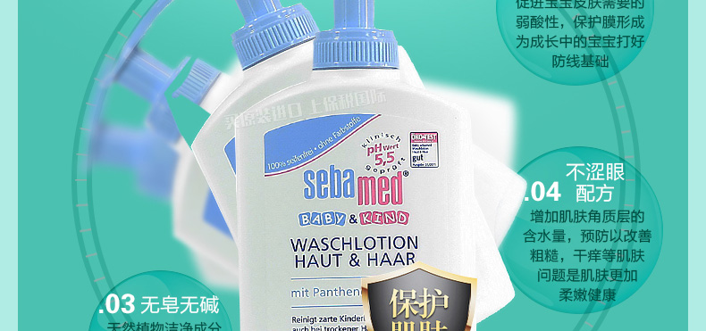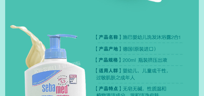 德國施巴Sebamed二合一嬰兒洗發沐浴露 無淚配方 溫和清潔護膚 200ml/瓶—— 1、富含保濕因子和珍貴角鯊烯成分,有效平衡水油。 2、無皂無堿,不含石蠟等化學成分,溫和不刺激。 3、溫和PH值5.5,提供弱酸保護膜。 |