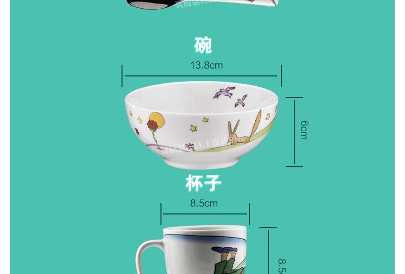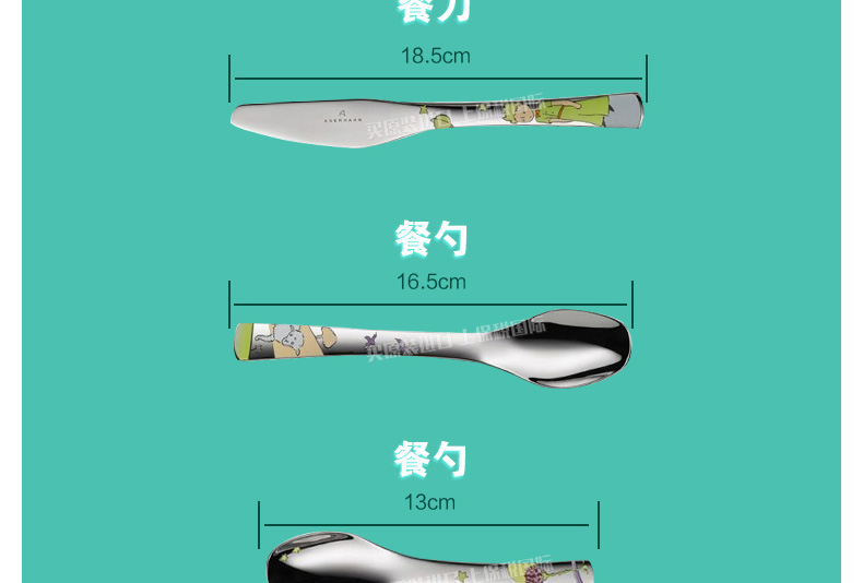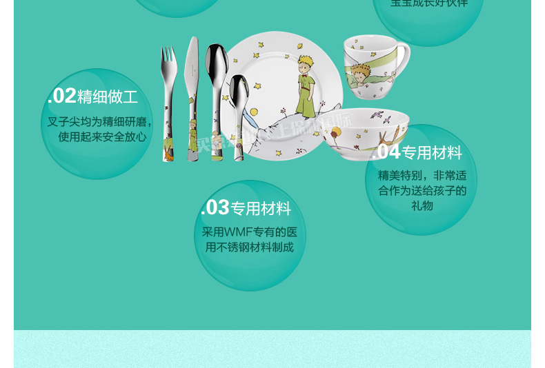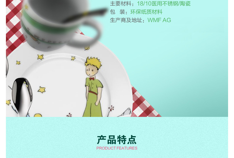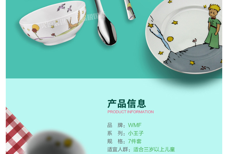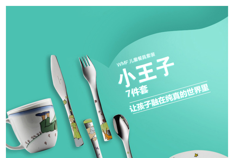 德國(guó)福騰寶WMF帥氣小王子兒童餐具7件套 不銹鋼刀叉勺調(diào)羹+陶瓷杯碗盤—— 1、不銹鋼刀、叉、勺、調(diào)羹+陶瓷杯,碗,盤。 2、帥氣小王子的卡通人物圖案。 |