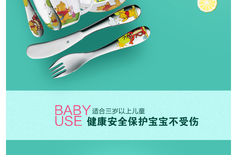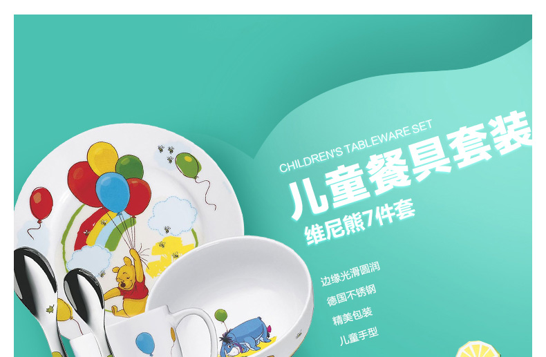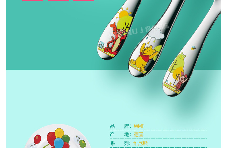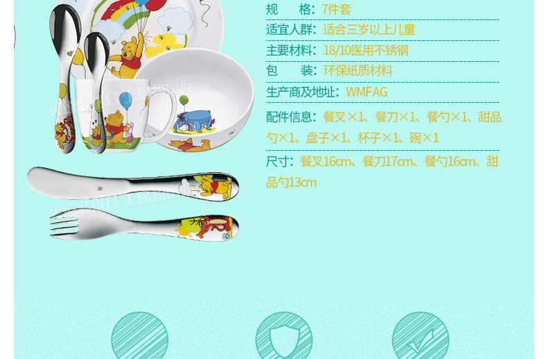 德國福騰寶WMF維尼熊兒童餐具7件套 不銹鋼刀叉勺調(diào)羹+陶瓷杯碗盤—— 1、不銹鋼刀、叉、勺、調(diào)羹+陶瓷杯,碗,盤。 2、可愛的維尼熊卡通動物圖案,童趣十足。 |