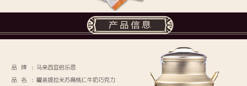 馬來西亞倍樂思罐裝提拉米蘇扁桃仁牛奶巧克力 香甜酥脆 送禮佳品 120g/罐—— 1、香甜酥脆,醇正潤滑。 2、高檔罐裝,送禮佳品。 3、辦公室必備零食。 |