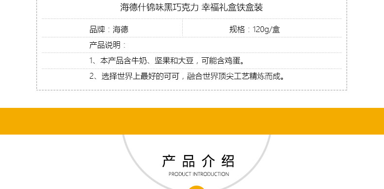 海德什錦味黑巧克力 幸福禮盒鐵盒裝 休閑食品小零食 補充能量 送禮佳品 120g/盒 |