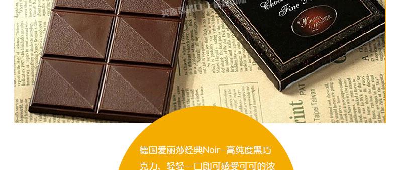 德國Elysia愛麗莎黑巧克力 可可含量85% 艾麗西婭可可黑巧克力 休閑零食 100g/盒—— 1、成分:可可液塊,可可脂,白砂糖。 2、純度較高的黑巧較苦,不適合大快朵頤,需要小口小塊兒用心品嘗黑巧的香味。 |