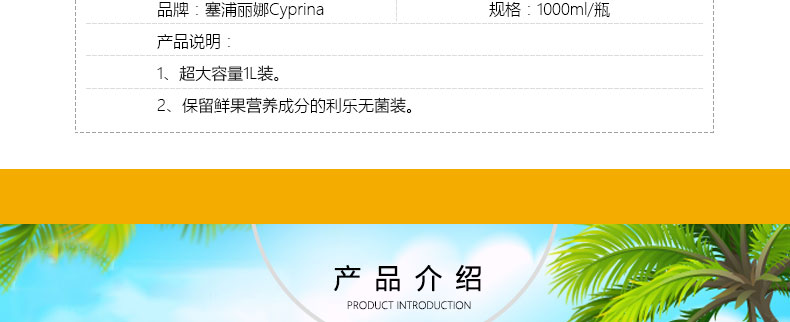 1、超大容量1L裝。2、保留鮮果營養成分的利樂無菌裝。 |