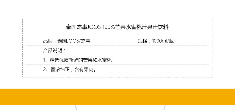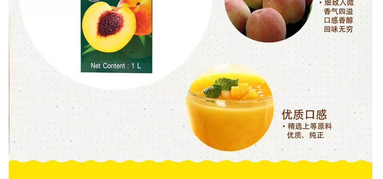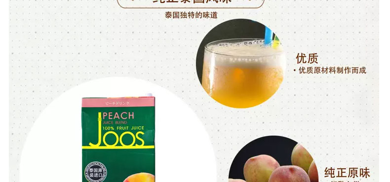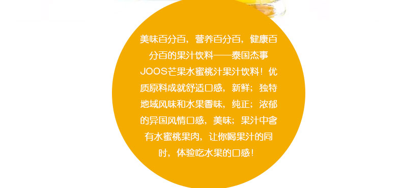 泰國杰事JOOS 100%芒果水蜜桃汁果汁飲料1L裝 含蜜桃果肉 香濃營養 —— 1、精選優質新鮮的芒果和水蜜桃。 2、香濃純正,含有果肉。 |