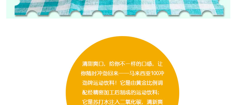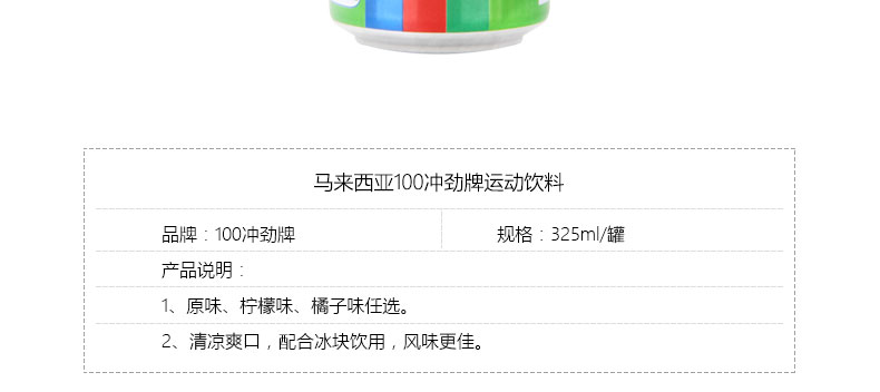 馬來西亞100沖勁牌運(yùn)動(dòng)飲料 原味/檸檬味/橘子味 清甜爽口 325ml/罐—— 1、原味、檸檬味、橘子味任選。 2、清涼爽口,配合冰塊飲用,風(fēng)味更佳。 |