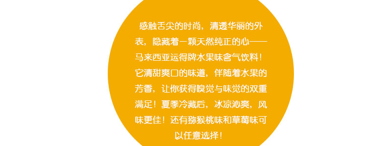 馬來西亞運得牌水果味含氣飲料 獼猴桃味/草莓味 清涼爽口 350ml/罐—— 1、獼猴桃味、草莓味可選。 2、清涼爽口,開蓋即飲,冷藏更佳。 |