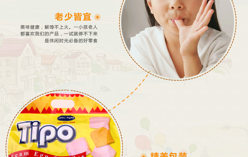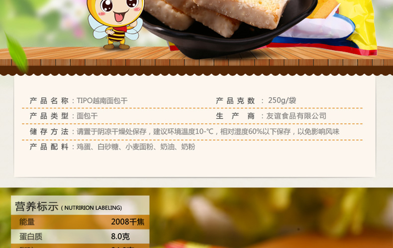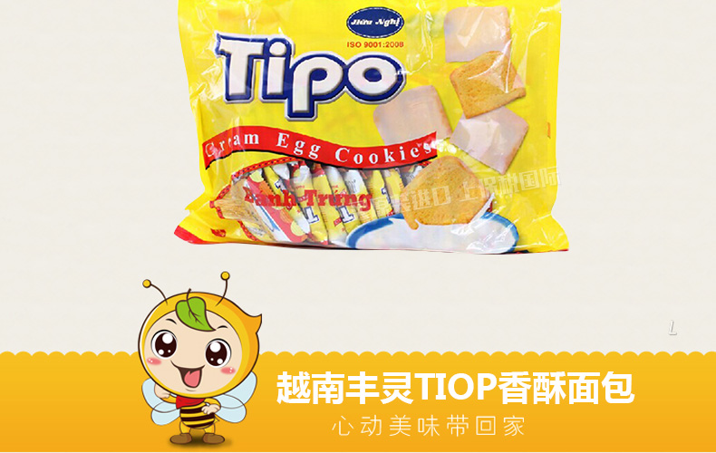 越南豐靈TIPO香酥面包干雞蛋牛奶味餅干 奶香濃郁 便攜小包裝的辦公室零食250g/袋—— 1、上層奶油,下層雞蛋面包干。 2、奶香濃郁,香酥可口。 3、干凈便攜的獨立小包裝。 |
