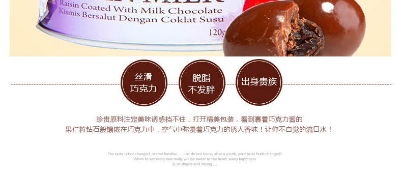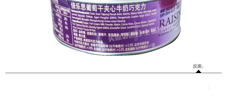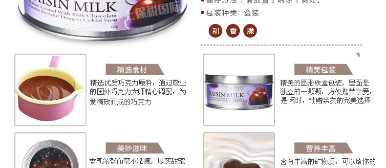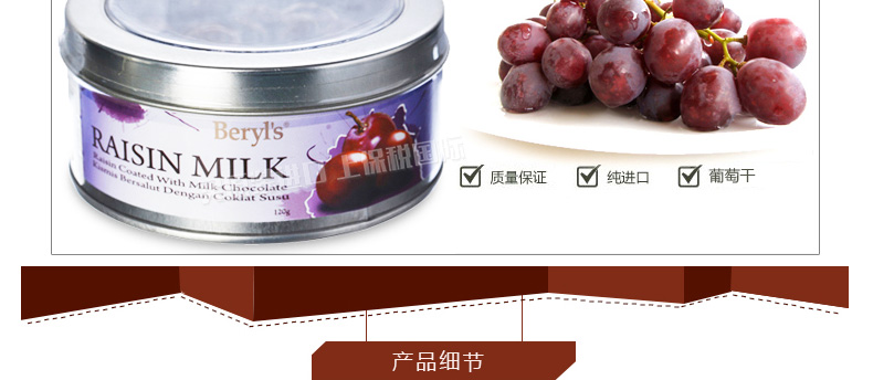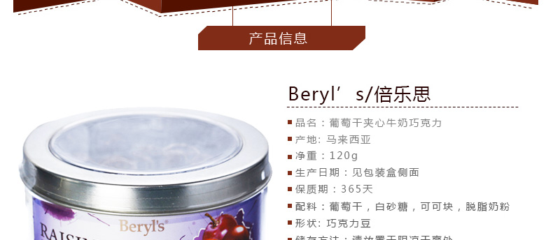 倍樂思Beryl's 葡萄干夾心牛奶巧克力 馬拉西亞即食休閑零食120克/罐—— 1、本產品含有少量花生、堅果和麥麩等。 2、不添加任何影響健康的食品添加劑,健康美味。 |