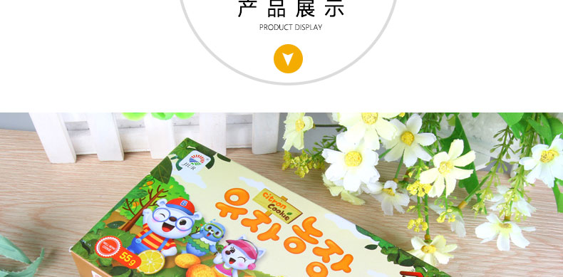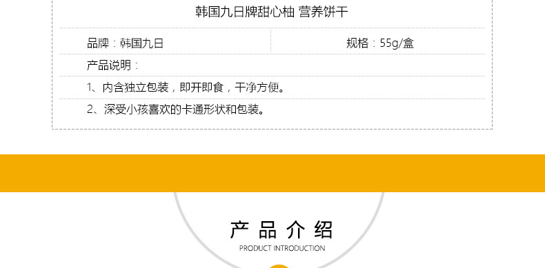 韓國九日牌甜心柚 營養餅干 兒童磨牙餅干 休閑零食健康糕點 55g/盒—— 1、內含獨立包裝,即開即食,干凈方便。 2、深受小孩喜歡的卡通形狀和包裝。 |