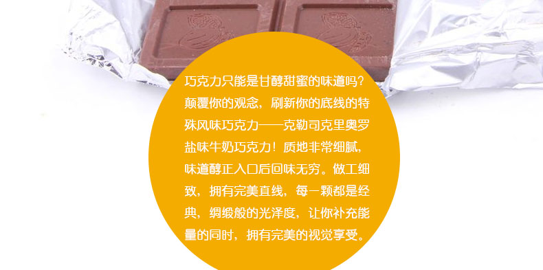 克勒司 純可可脂朱古力排塊克里奧羅鹽味牛奶巧克力 100g/盒—— 1.口感細(xì)膩絲滑,味道醇正。 2.克里奧羅鹽味巧克力,感受異國別樣的風(fēng)情。 |