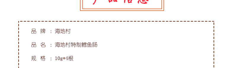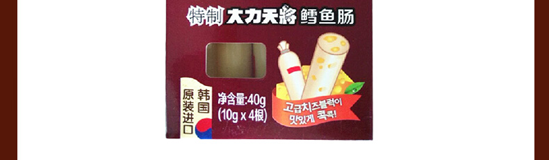 韓國海地村特制鱈魚腸 10g*4根 寶寶輔食火腿腸 兒童肉腸 休閑食品零食 40g/盒—— 1、可以直接撕開吃,放粥里、飯里伴著吃,煎炸煮都好吃。 2、鱈魚腸中的黑點是鱈魚皮,含有膠原蛋白、鈣、鐵等微量元素,可放心給寶寶食用。 |