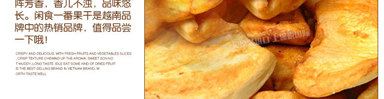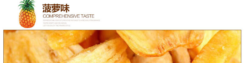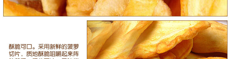 越南閑食一番菠蘿蜜果干菠蘿干 清甜酥脆 休閑零食必備選擇 100g/袋—— 1、新鮮菠蘿切片烘烤而成。 2、口感酥脆,清鮮甜美。 |