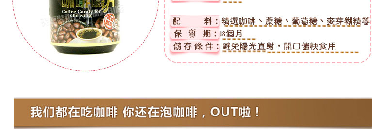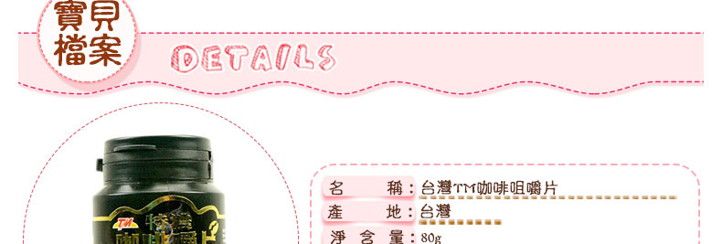 臺(tái)灣 TM特濃咖啡嚼片 提神醒腦戒煙神器辦公室休閑零食 熬夜加班必備 80g/罐—— 1.開車嚼一粒,提神醒腦,開開心心出門,安安全全回家。 2.不再費(fèi)時(shí)泡咖啡,順手來幾粒,嚼一嚼精神好,效率高。 |