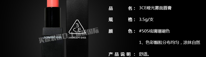 韓國stylenanda 3CE啞光霧面唇膏 #505琉璃珊瑚色 清爽口紅唇彩 3.5g/支—— 1、色彩顆粒分布均勻,涂抹自然舒適。 2、貼合唇部肌膚,賦予美唇無限潤澤,有效預防唇部干燥。 |