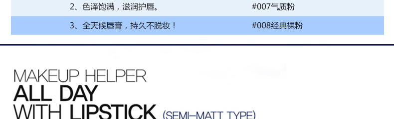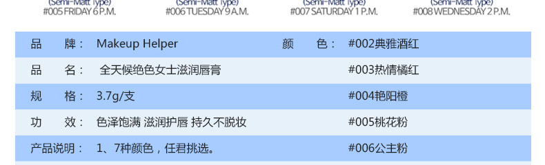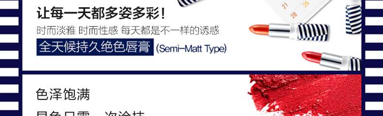 韓國Makeup Helper全天候絕色女士滋潤唇膏 色澤飽滿不脫妝 7種顏色任選—— 1、7種顏色,任君挑選。 2、色澤飽滿,滋潤護唇。 3、全天候唇膏,持久不脫妝! |