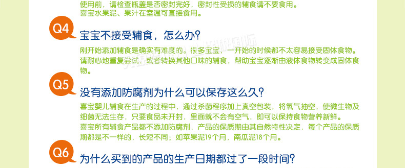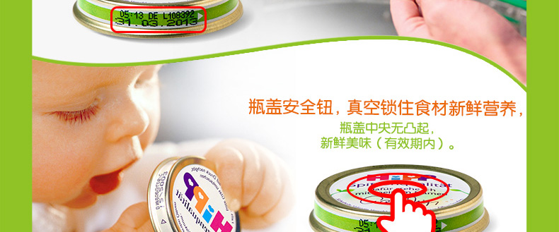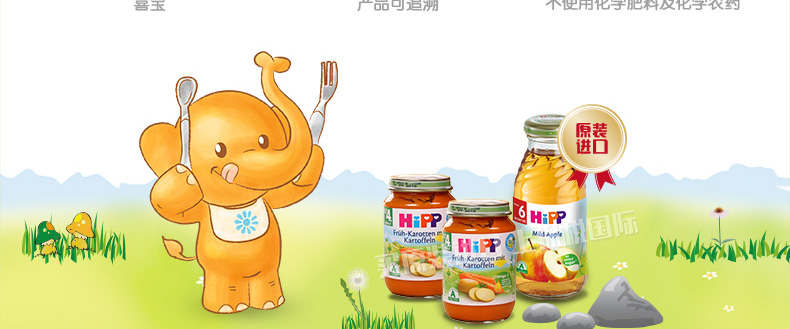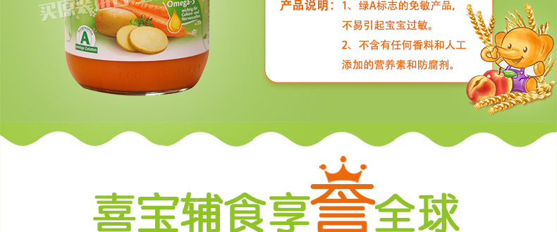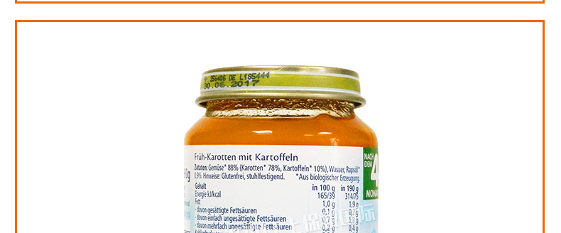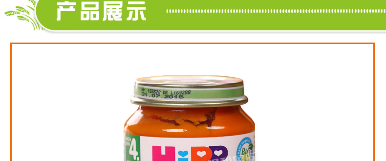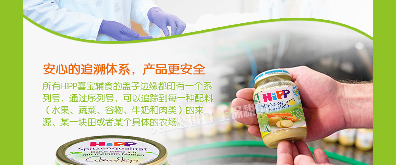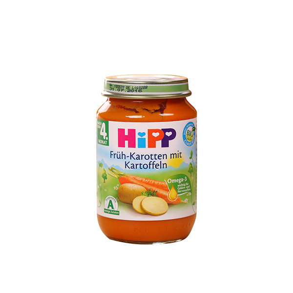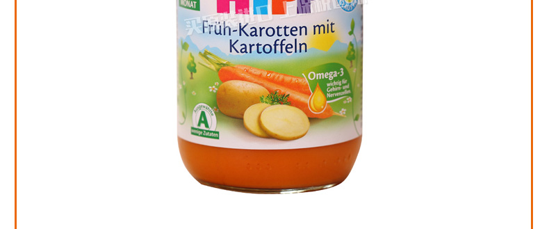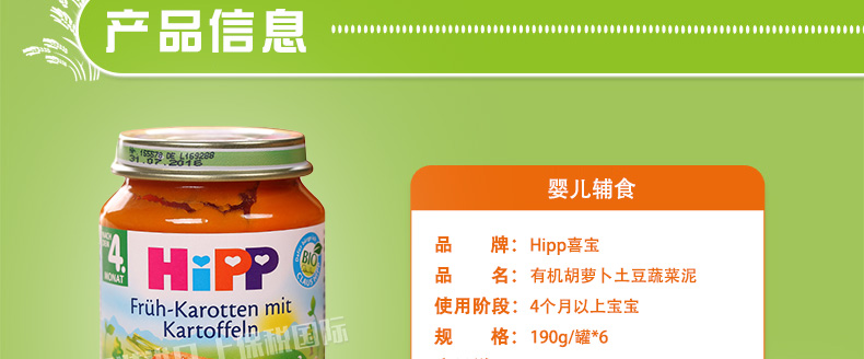 6罐裝 喜寶HiPP胡蘿卜土豆蔬菜泥 嬰兒輔食 有機純免敏4個月以上寶寶果泥混合泥 190g/罐*6—— 1、綠A標(biāo)志的免敏產(chǎn)品,不易引起寶寶過敏。 2、作為輔食、餐后水果或混合米粉食用。 3、不含有任何香料和人工添加的營養(yǎng)素和防腐劑。 |